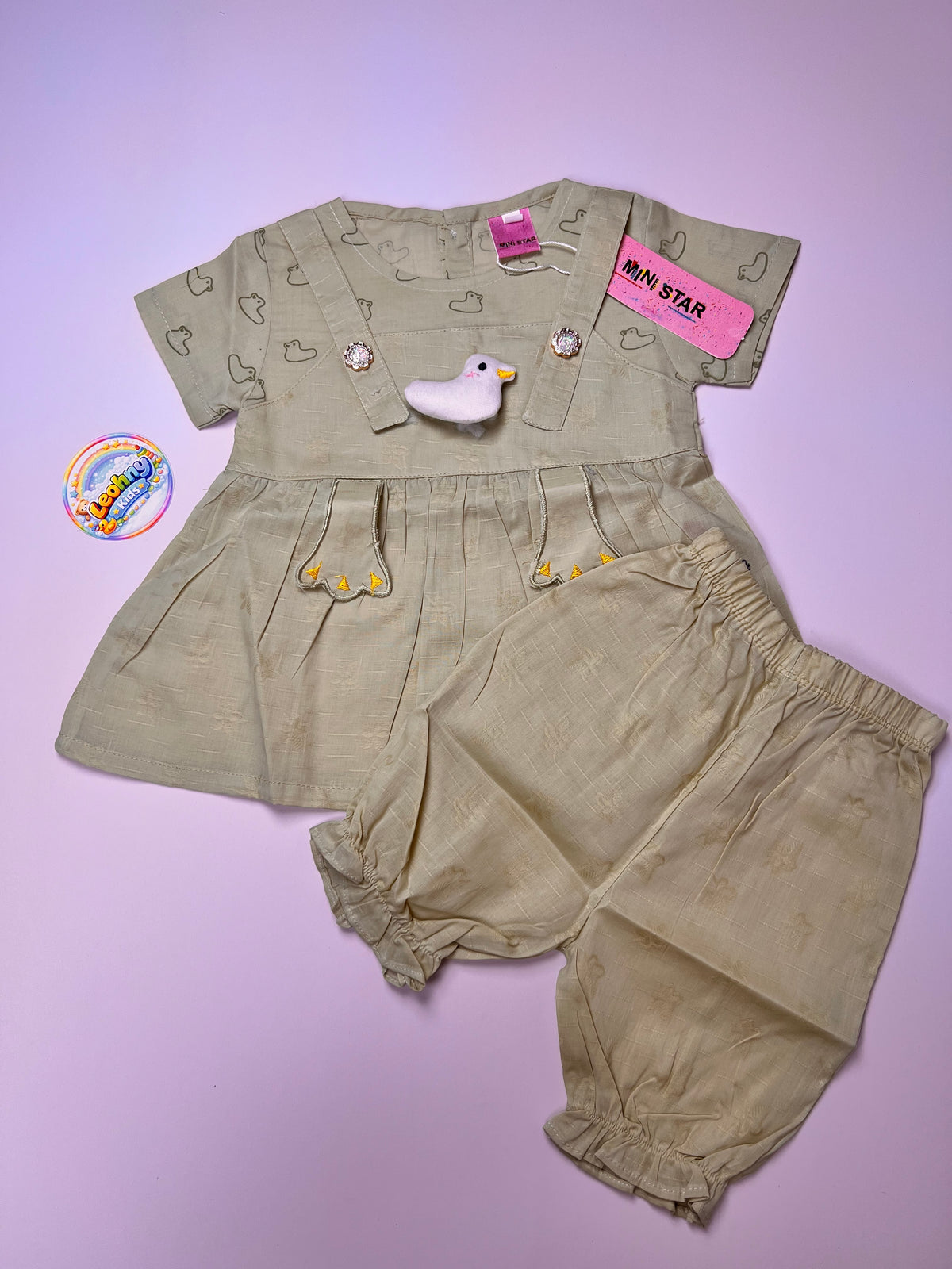 A charming and breezy 2-piece outfit for baby girls, featuring a lightweight flared frock with a sweet duckling theme and matching ruffled bloomers. Designed for maximum comfort during warm weather, this set combines delicate pastel tones with playful 3D accents for a truly adorable look.
