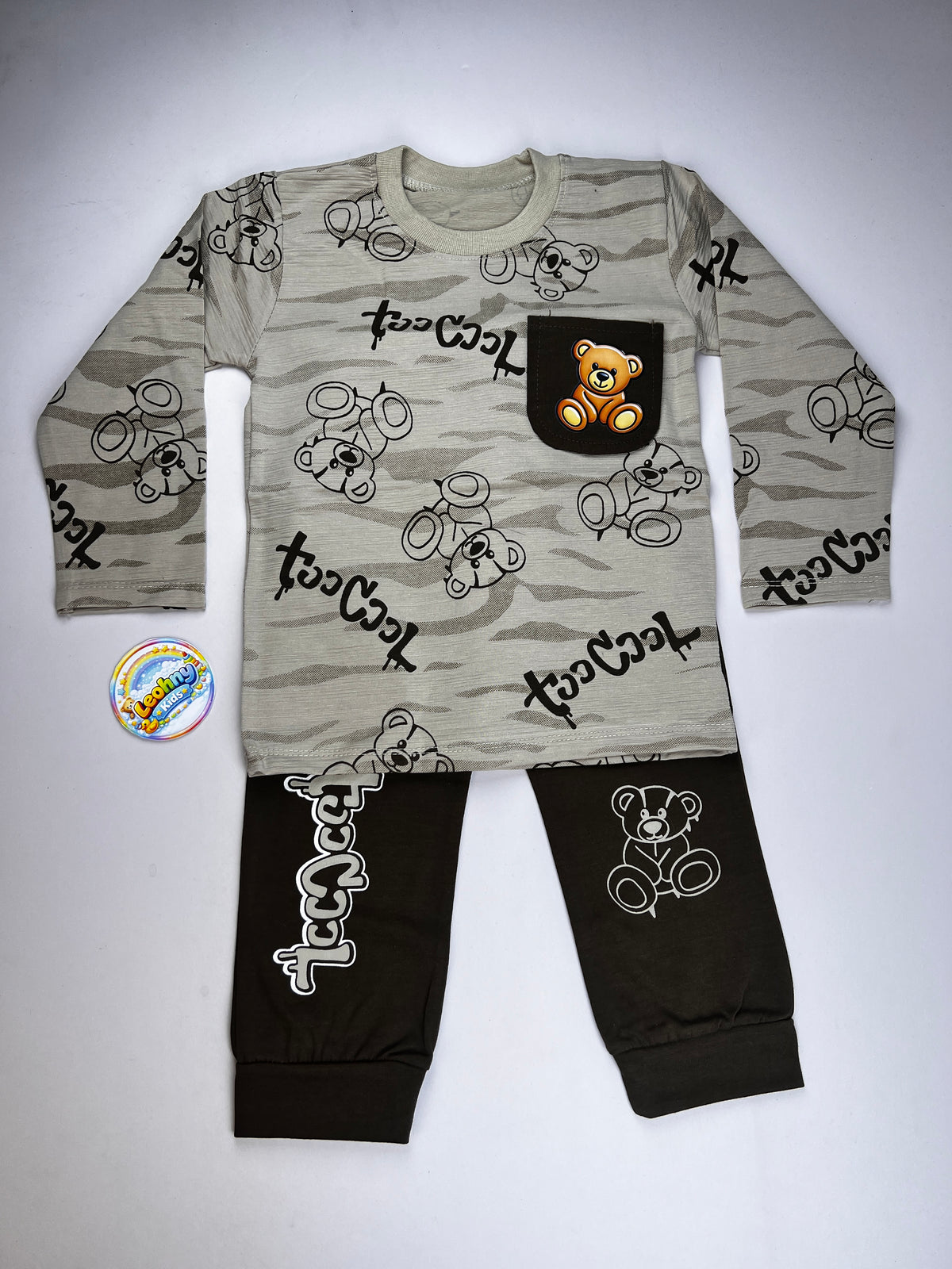 A trendy and modern 2-piece outfit for boys featuring an all-over "Too Cool" bear print and a unique contrast chest pocket. Designed with a contemporary heathered effect, this set offers a sharp streetwear look for active youngsters.
