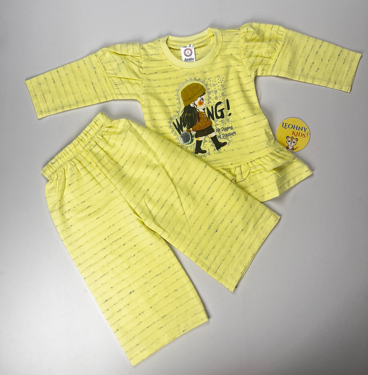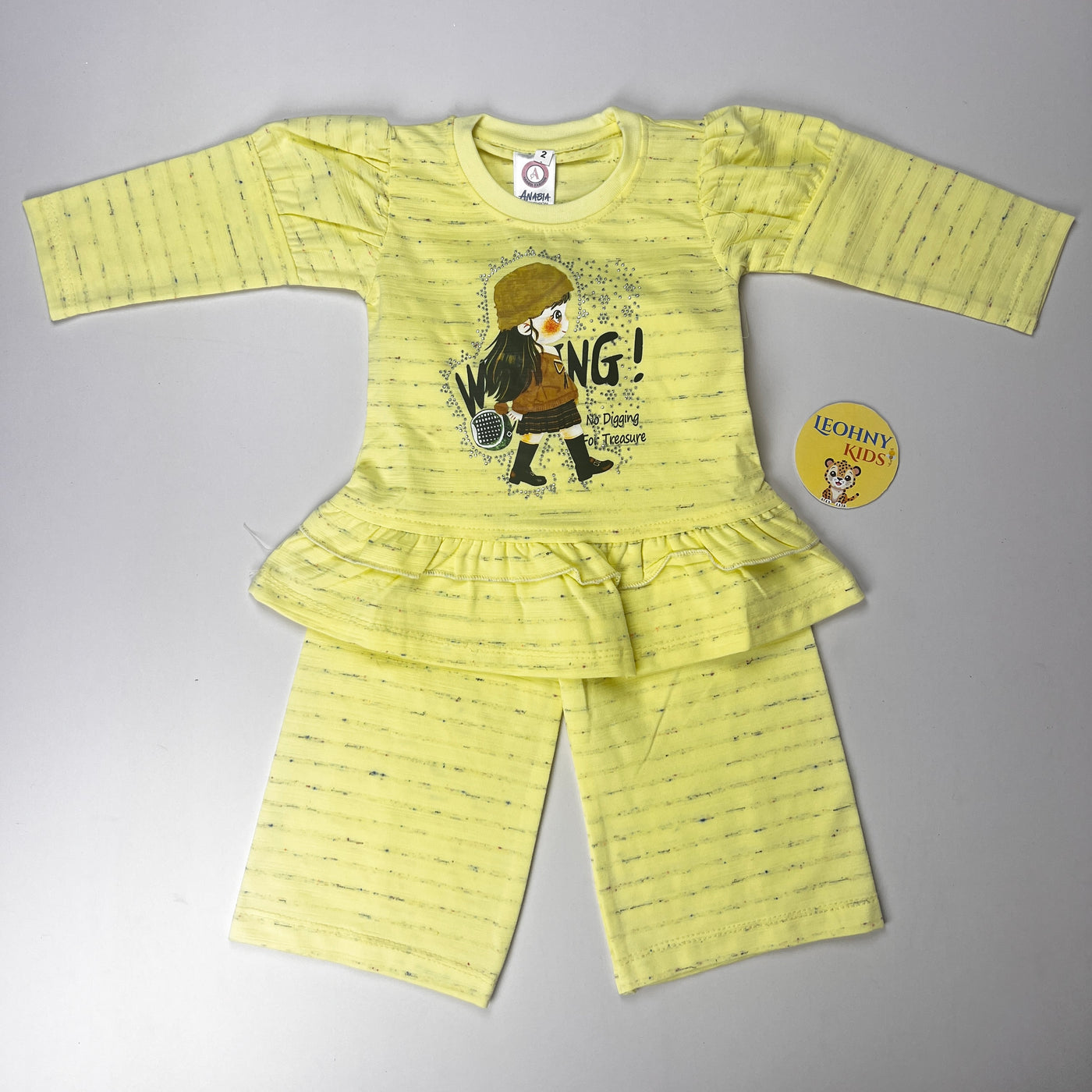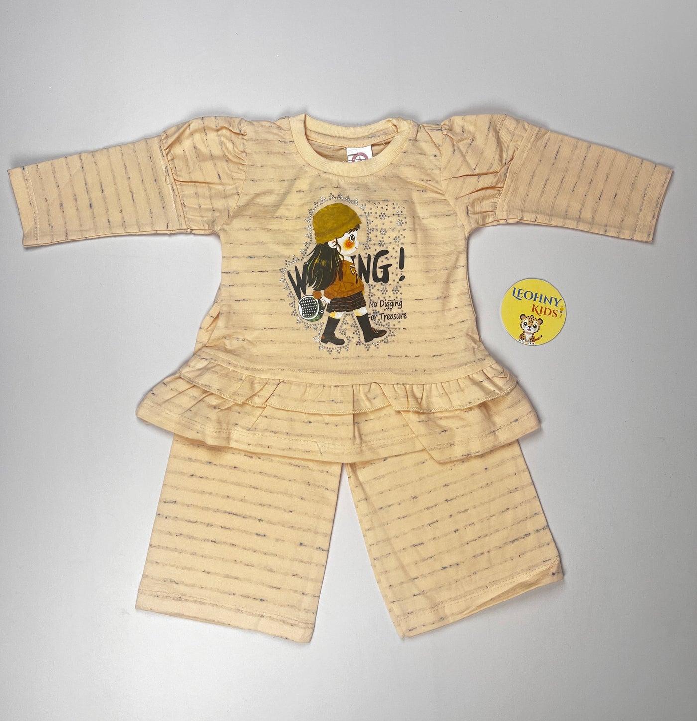 Stylish and comfortable 2-piece outfit for baby girls featuring a cute printed top with frill detail and matching trousers. Perfect...