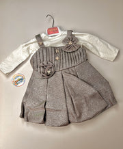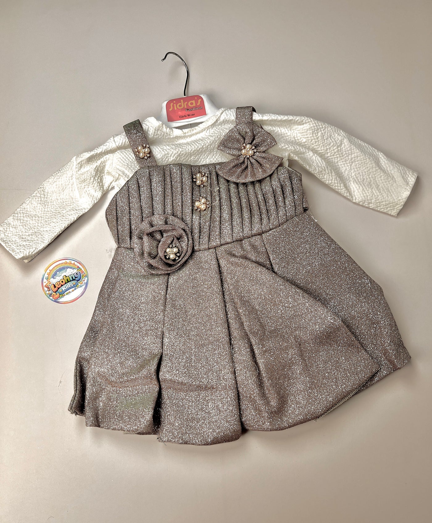 Make every occasion special with the Sidra’s Fashion Luxury Shimmer Dress. This stunning two-piece ensemble combines a high-quality textured white long-sleeve inner top with a glittering metallic-finish pinafore dress. Adorned with delicate pearl accents and floral detailing, this outfit is designed to provide a sophisticated "Leohny Kids" look for weddings, birthdays, and formal celebrations.
