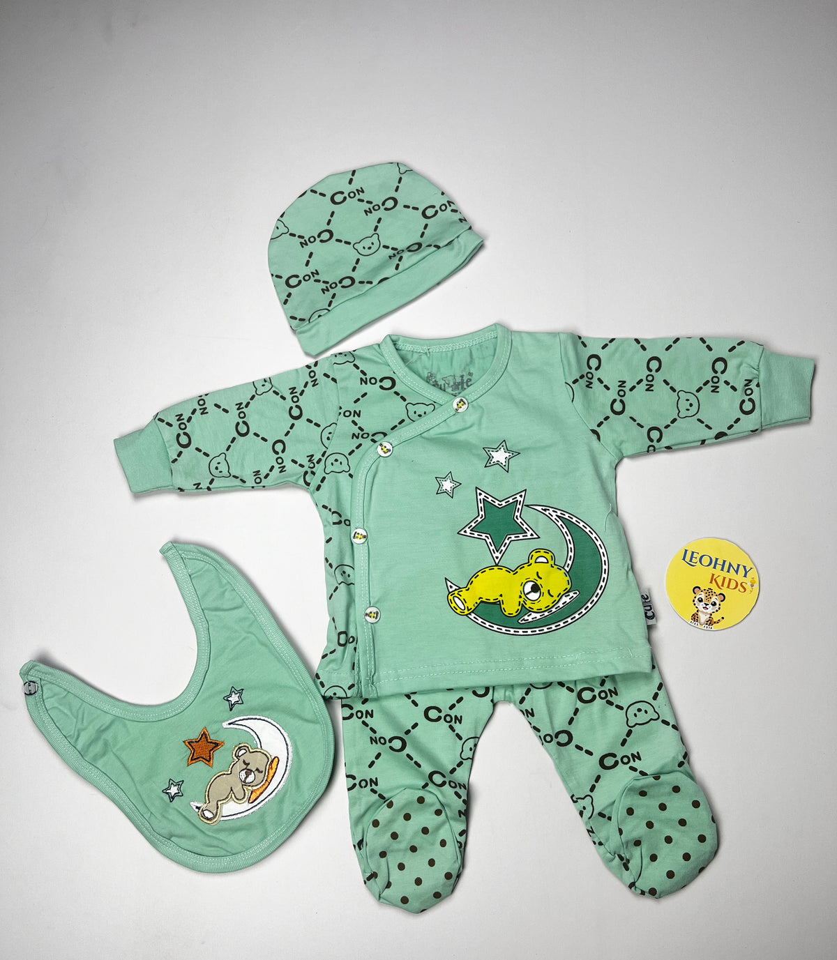 An ultra-soft and practical 3-piece essential set for newborns, featuring a side-snap jammie, a matching knotted cap, and a coordinated bib. Designed with a gentle "Sleepy Bear on the Moon" theme, this set provides maximum comfort for your baby’s first months.